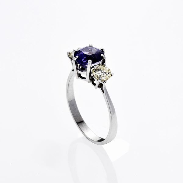 MATERIALE: oro bianco, diamanti e zaffiro viola DESCRIZIONE: anello realizzato con al cnetro zaffiro viola taglio ovale tra due diamanti taglio brillanti, reca il marchio 750 MISURA: anello 14 PESO: zaffiro ct 2.0, diamanti ct 0.60, L-M, purezza VS-SI, gr 2.9