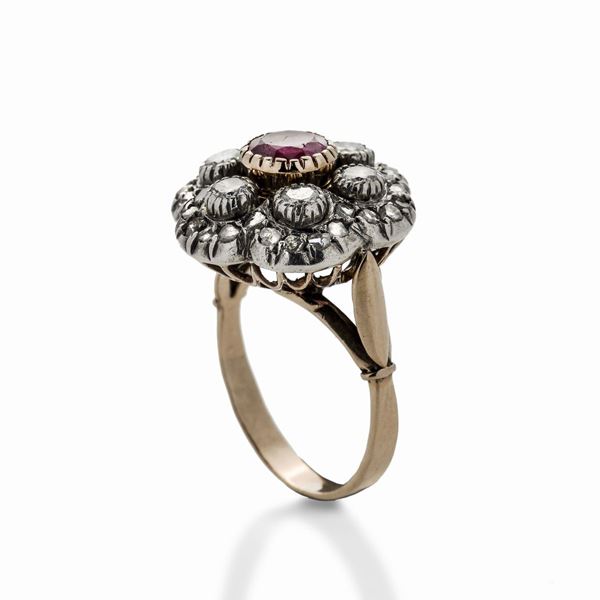 MATERIALE: oro giallo, argento, diamanti e rubino DESCRIZIONE: anello realizzato con al centro rubino taglio rotondo impreziosito da diamanti taglio brillante e rose di diamante MISURE: anello 16 PESO: gr 6.7