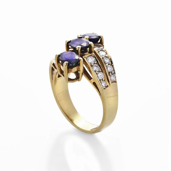 MATERIALE: oro giallo, diamanti e zaffiri DESCRIZIONE: anello realizzato con al centro tre zaffiri taglio ovale impreziositi da diamanti taglio brillante disposti su tre fasce, reca il marchio 750 MISURE: anello 14 PESO: gr 9.9
