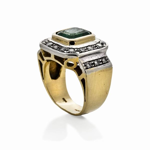 Anello in oro giallo, oro bianco, diamanti e smeraldo