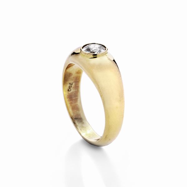MATERIALE: oro giallo e diamante DESCRIZIONE: anello a fascia con al centro diamante taglio brillante, reca il marchio 750 MISURE: anello 21 PESO: diamante ct 0,70, gr 10.8
