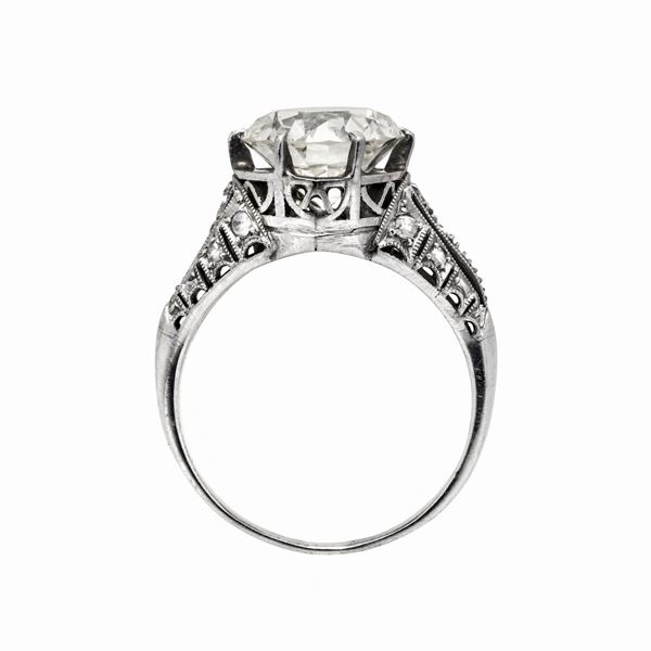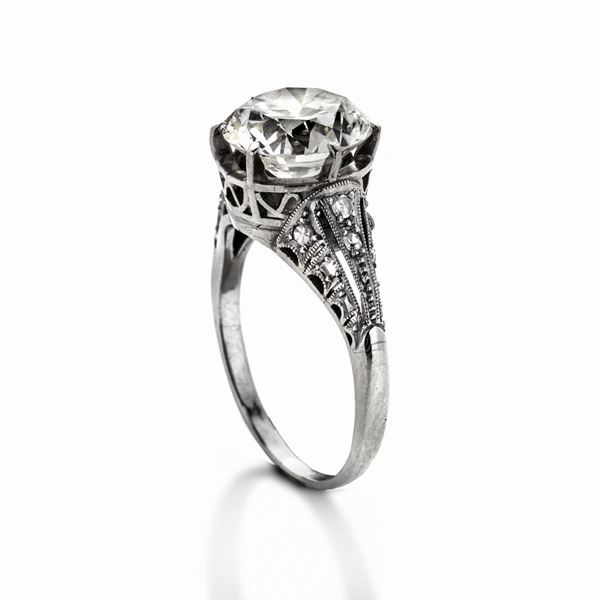 MATERIALE: platino e diamanti DESCRIZIONE: anello solitario realizzato con al centro diamante mezzo taglio su alta base lavorata a tricot ed impreziosita da rose di diamante MISURE: anello 16 PESO: diamante ct 4.0, colore L, purezza VS, gr 6.2