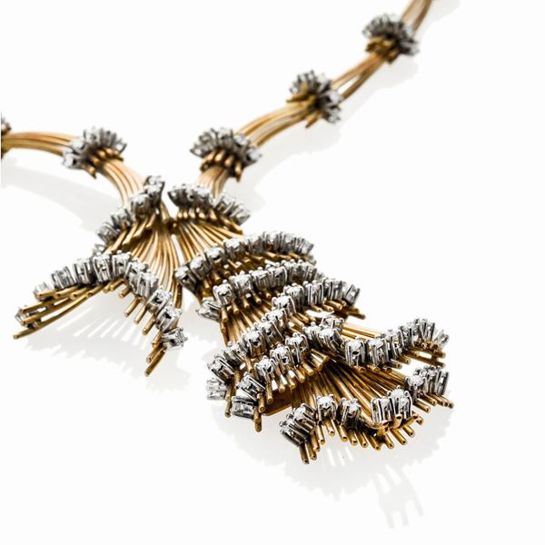 MATERIALE: oro giallo e diamanti DESCRIZIONE: grande collier semirigido, creato ad imitazione del nastro, realizzato con segmenti in oro impreziositi da file di diamanti taglio brillante, la parte centrale, di forma asimmetrica, è caratterizzata da una lunga parte pendente leggermente snodabile, illuminata da diamanti taglio brillante, reca il marchio 58 MISURE: aperta cm 28.5 PESO: diamanti ct 5.70 circa, colore G, purezza SI, gr 96.60