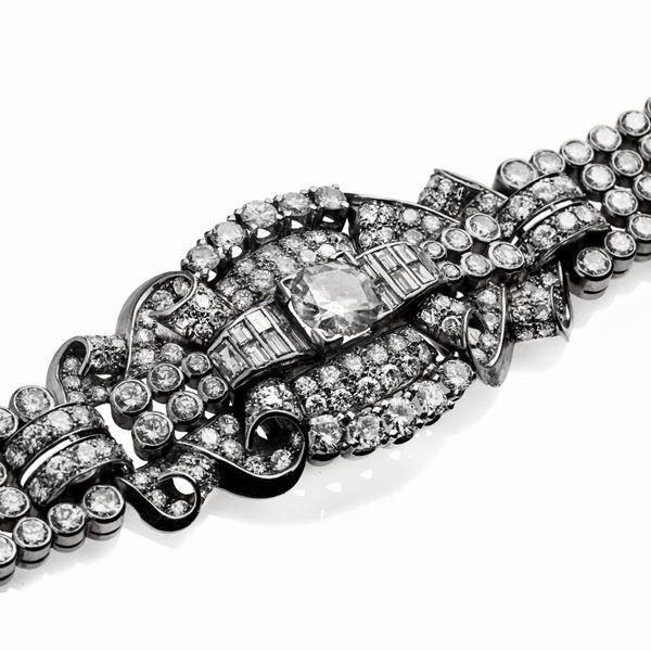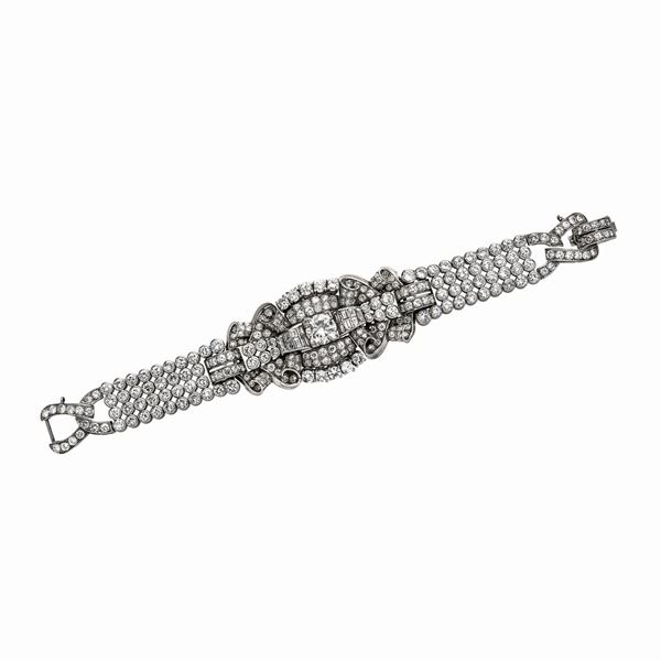 MATERIALE: platino e diamanti DESCRIZIONE: importante bracciale realizzato ad imitazione del nastro, centrato da diamante taglio brillante intermante incorniciato da diamanti taglio brillante e taglio baguette, ai lati il bracciale è formato da quattro file di diamanti taglio brillante con chiusura gioiello, reca il punzone francese dell'oro e reca il marchio I.I.a. Platine MISURE: aperto cm 18.5 PESO: diamante centrale ct 2.90, colore I, milky, diamanti totali ct 12.8, colore G-H, purezza VS-VVS, gr 76.7