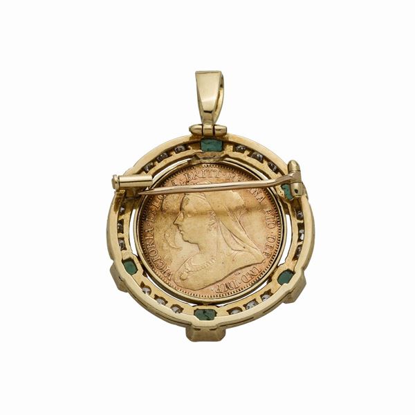 MATERIALE: oro giallo, diamanti e smeraldi DESCRIZIONE: spilla pendente centrata da sterlina in oro incorniciata da fascia con diamanti taglio brillante e smeraldi taglio rettangolare MISURE: 4.5x3 PESO: diamanti ct 0.60, gr 19,9