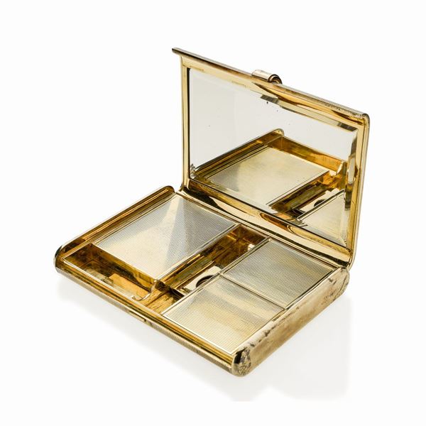 MATERIALE: argento dorato e oro DESCRIZIONE: trousse di forma rettangolare, parte esterna ed interna in argento dorato inciso, fibbia in oro giallo 18 kt, all'interno tre vani porta trucchi e specchio, reca il marchio 925 e 750 MISURE: cm 10.5x14x2 PESO: gr 600 circa