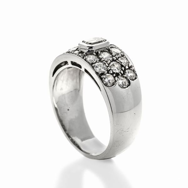 MATERIALE: oro bianco e diamanti DESCRIZIONE: anello a fascia realizzato con al centro diamante taglio smeraldo impreziosito da pavè di brillanti MISURE: diametro interno 20 PESO: diamante centrale ct 0.45 , colore J, purezza VS, diamanti laterali colore ct 1.50, G-H, purezza VS, gr 12,4