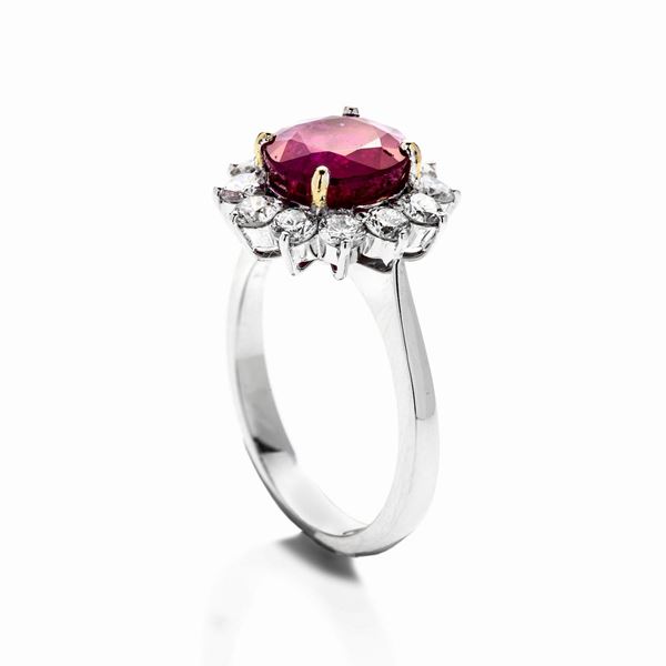 MATERIALE oro bianco, diamanti e rubini birmano naturale DESCRIZIONE:anello a margherita con al centro rubino taglio ritondo incorniciato con diamanti taglio brillante MISURE: anello 14 PESO: rubino naturale ct 3.76, corredato di certificato Gemmological Certification Services, Londra, n 78169-27, gr 6.2