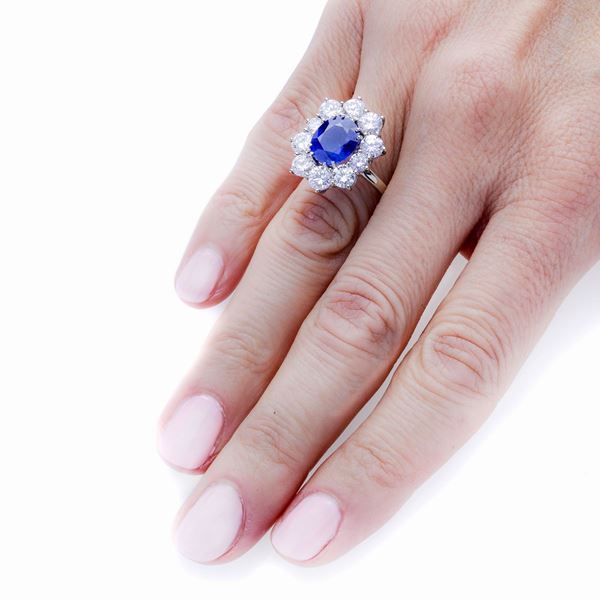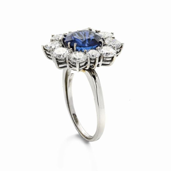 MATERIALE: oro bianco, diamanti e zaffiro naturale DESCRIZIONE: anello a margherita con al centro uno zaffiro taglio ovale incorniciato da diamanti taglio brillante MISURE: diametro interno 15 PESO: diamanti ct 2.70, colore H, purezza VS, zaffiro naturale ct 3.80, corredato di certificato CISGEM n. 8026, del 2017.10.24,gr 6.7