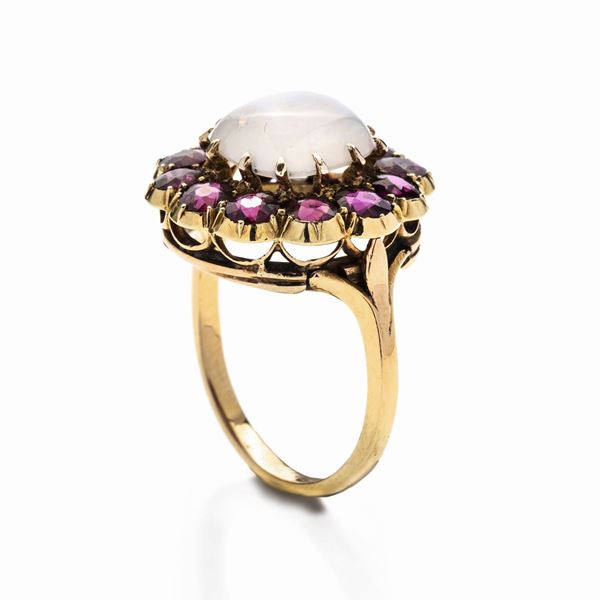 MATERIALE: oro giallo, rubini e opale DESCRIZIONE: anello a margherita realizzato con opale taglio quadrato cabochon incorniciato da rubini, reca il amrchio 18 kt MISURE: anello 11 PESO. 5.7