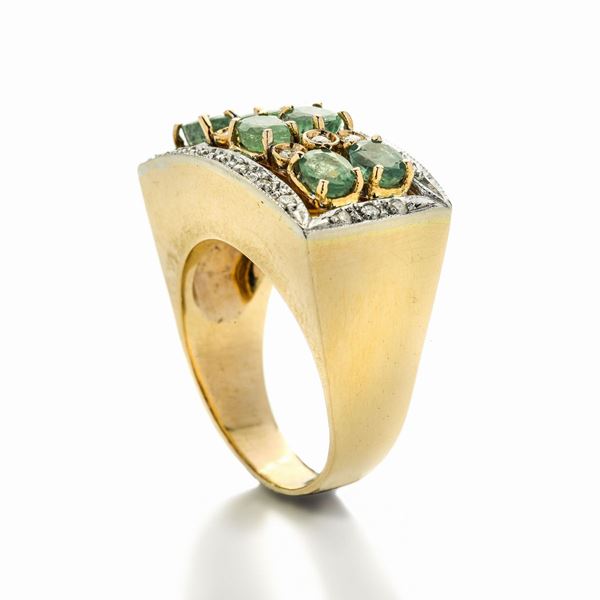 MATERIALE: oro bianco, giallo, diamanti e smeraldi DESCRIZIONE: anello a ponte realizzato con tre file di due smeraldi taglio ovale alternati a diamanti taglio brillante, cornice impreziosita da piccoli brillantiMISURE: anello 17 PESO : gr 12.4