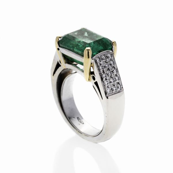 MATERIALE: oro bianco, oro giallo, diamanti e smeraldo DESCRIZIONE: anello a ponte realizzato con al centro smeraldo taglio rettangolare su alta base impreziosita ai lati da pavè di brillanti, reca il marchio 750 MISURE: anello 11 PESO: smeraldo ct 6.50, gr 14.0