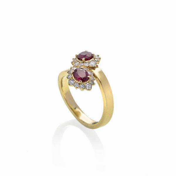 MATERIALE: oro giallo, diamanti e rubini DESCRIZIONE: anello contrariè con finali ciascuno realizzato come una margherita centrata da rubino taglio ovale ed incorniciata da diamanti taglio brillante MISURE: anello 14 PESO: diamanti ct 0.70, gr 7.1