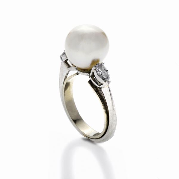MATERIALE: oro bianco, diamanti e perla coltivata DESCRIZIONE: anello con grande perla tra due diamanti taglio navette, con anello interno per ridurre la misura MISURE: anello 5 PESO: perla mm 8, diamanti ct 0.20, gr 5.5