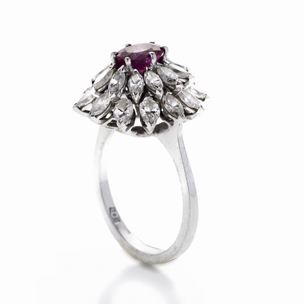 MATERIALE: oro bianco, diamanti e rubino DESCRIZIONE: anello realizzato con al centro rubino taglio ovale su alta base impreziosita da due file di diamanti taglio navette, reca il marchio 750 MISURE: anello 13 PESO: rubino ct 1.0, diamanti ct 2.50, colore I, purezza VS, gr 5.4