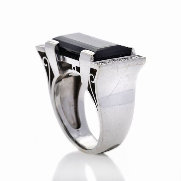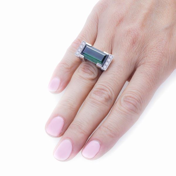 MATERIALE: oro bianco, diamanti e tormalina verde DESCRIZIONE: anello, di ispirazione geometrica, realizzato con grande tormalina verse taglio rettangolare impreziosita, in ogni lato, da serie di tre diamanti taglio brillante, reca il marchio 750 MISURE: anello 13 PESO: diamanti ct 0.40 circa, gr 14.5
