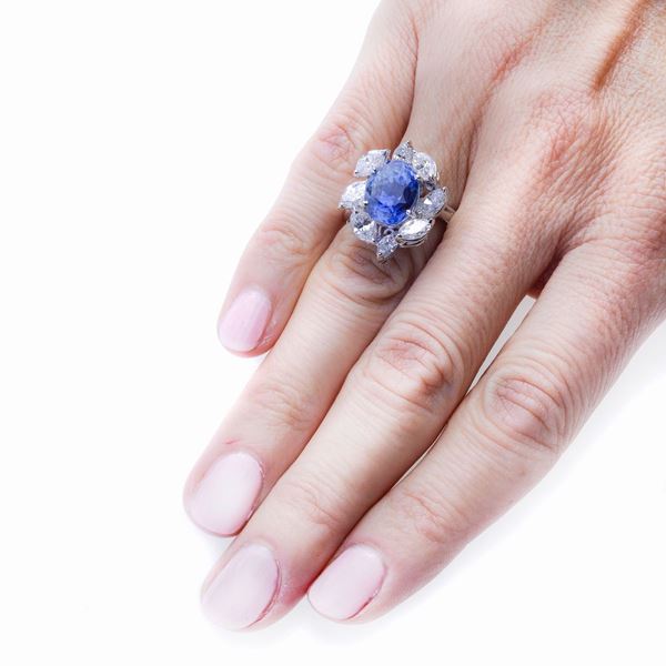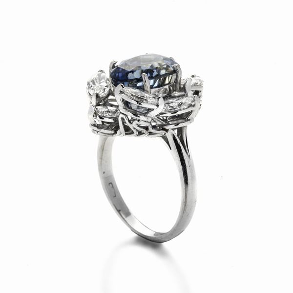 MATERIALE: oro bianco, diamanti e zaffiro DESCRIZIONE: anello realizzato con al centro zaffiro chiaro taglio ovale incorniciato con diamanti taglio marquise MISURE: anello 10 PESO: zaffiro ct 7.70, diamanti ct 1.80, colore G, purezza VS, gr 8.9