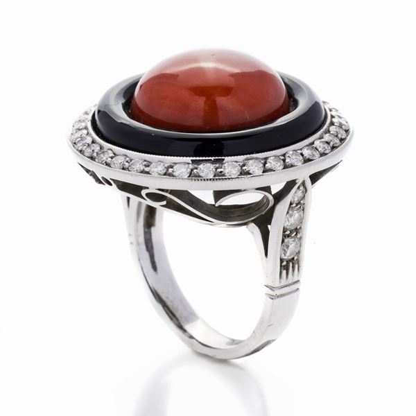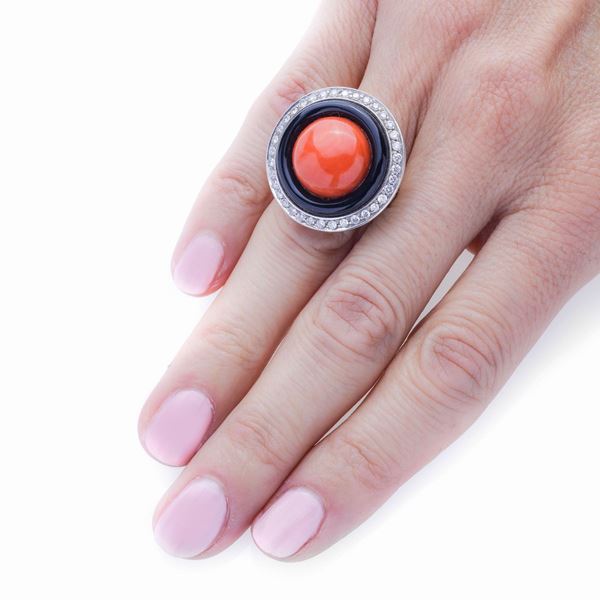 Anello in oro bianco, diamanti, onice e corallo rosso