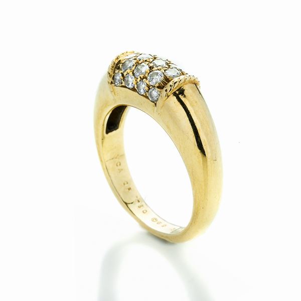 MATERIALE: oro giallo e diamanti DESCRIZIONE: anello realizzato come una fascia bombata con al centro pavè di diamanti, reca il marchio VCA 750 C69 B5001 R423 MISURE: anello 12 PESO: gr 6.1
