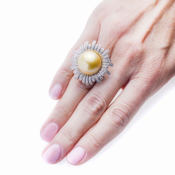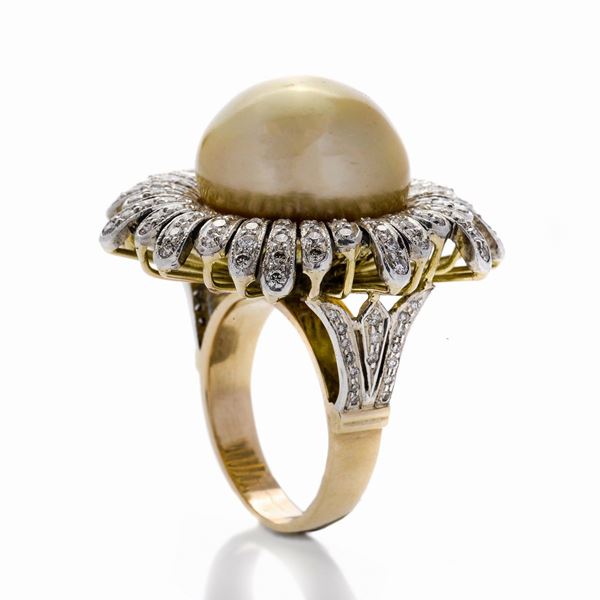 Anello in oro giallo, oro bianco, diamanti e perla gold