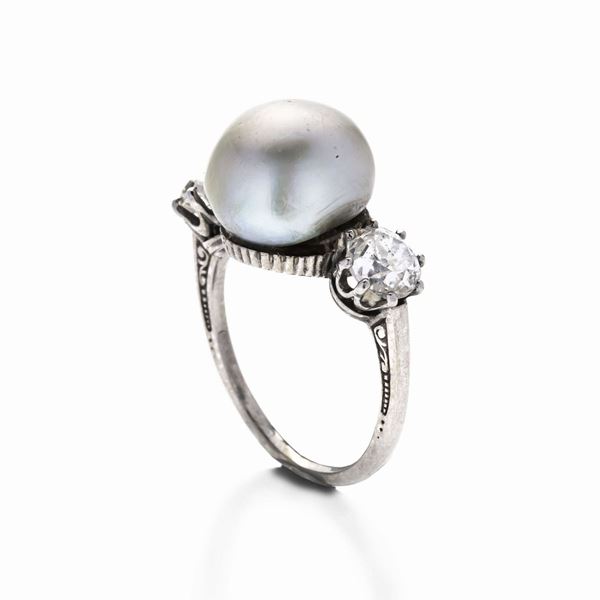 MATERIALE: platino, diamanti e perla grigia naturale DESCRIZIONE: anello con perla naturale tra due diamanti taglio vecchio, montatura laterale incisa con piccole volute MISURE: anello 9 PESO: perla mm 10.7x11.1x8.6, diamanti ct 0.50 circa, gr 4.3 la perla è corredato di certificato The Gem & Perl Laboratory, Londra, n. 08944