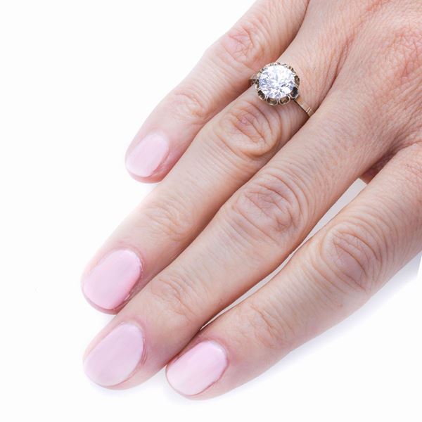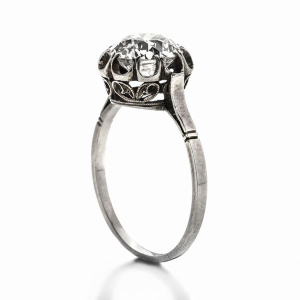 MATERIALE: oro bianco e diamante DESCRIZIONE: anello solitario realizzato con al centro diamante taglio vecchio montato con griffe su alta base a tricot impreziosita da foglie contrapposte MISURE: diametro interno cm 11.5 PESO: diamante ct 1.90 circa, colore H-I, purezza VS, gr 2.0