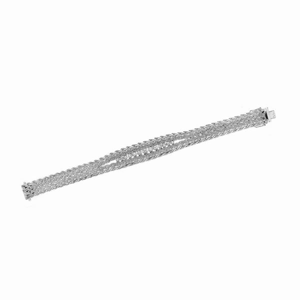 MATERIALE: oro bianco e diamanti DESCRIZIONE: bracciale realizzato ad imitazione del tessuto, con maglie intrecciate in oro e oro satinato centrato da trecidi diamanti taglio brillante MISURE: aperto cm 19.5 PESO: diamanti ct 0.80, gr 44.6