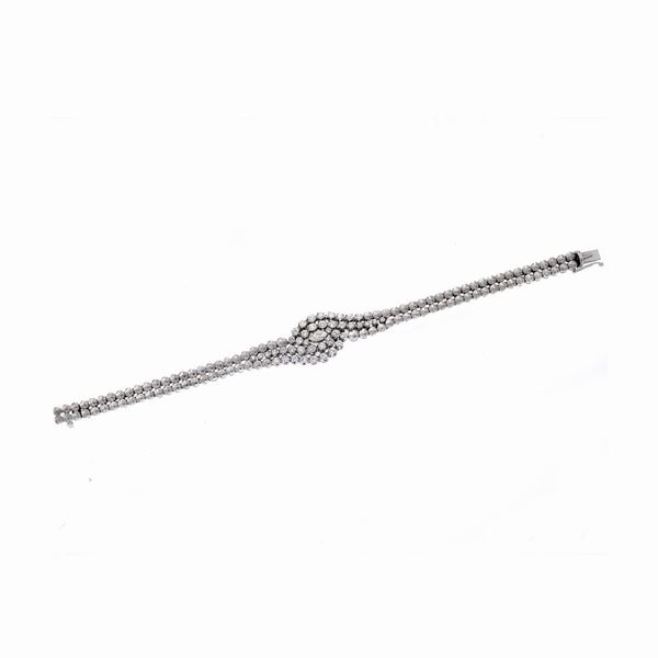 MATERIALE: oro bianco e diamanti DESCRIZIONE: bracciale realizzato con al centro due file di diamanti taglio brillante per lato centrati da un diamante taglio navette, cinturino lateriale con doppia fila di sfere in oro inciso, reca il marchio 750 MISURE: aperto lunghezza cm 18 PESO: diamanti marquise ct 0.30, altri diamanti ct 1.20 circa, gr 31.2