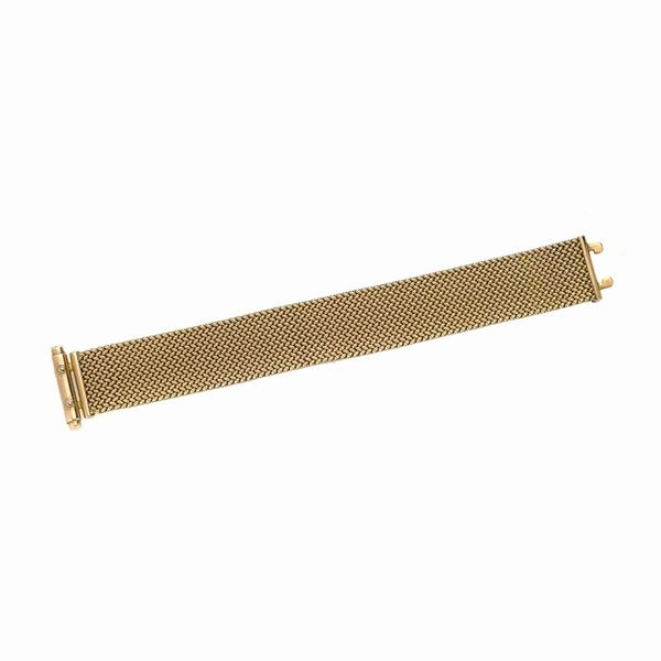 MATERIALE: oro giallo DESCRIZIONE:alto bracciale realizzato ad imitazione del tessuto, fermezza sagomata con parte centrale tubolare MISURE: aperto cm 18.5 PESO: gr 58.7