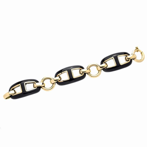 MATERIALE: oro giallo, argento e onice DESCRIZIONE: bracciale realizzato con grandi maglie rettangolari, bombate, in onice profilate in oro gialloalternate a maglie concentriche in oro, grande moschettone circolare, reca il marchio 925 e 750 MISURE: aperto cm 19 PESO: gr 82.1