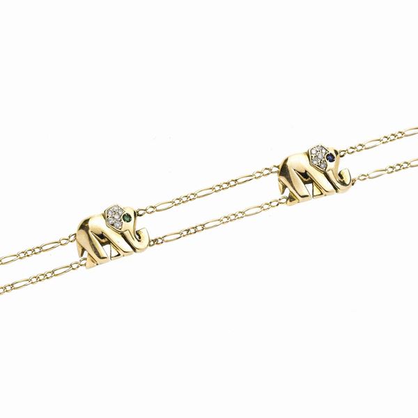 MATERIALE: oro giallo, diamanti, rubini, smeraldo e zaffiro DESCRIZIONE: bracciale realizzato con doppia catena a maglie intrecciate alternata a quattro elefanti con proboscide rivolta verso l'alto, ciascuno impreziosito da pavè di brillanti, un brillante mancante MISURE: aperto cm 21 PESO: diamanti ct 0.24, gr 14.7