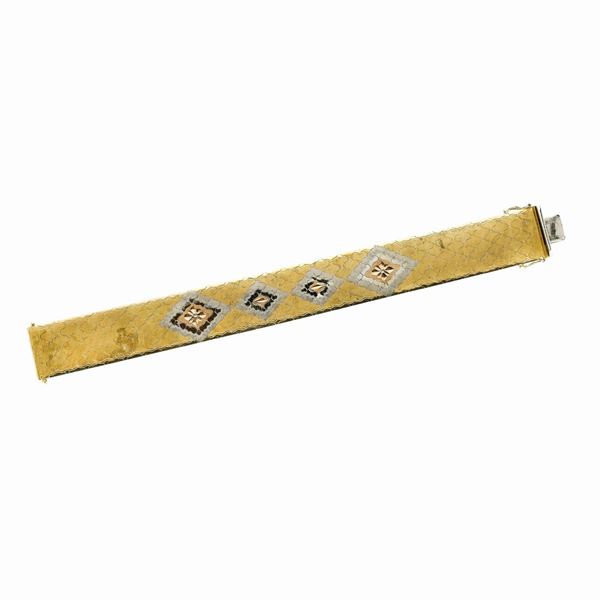 MATERIALE: oro giallo e oro bianco DESCRIZIONE: bracciale realizzato ad imitazione del tessuto, con maglie a nido d'ape in oro inciso centrate da quattro motivi romboidali eseguiti giocando sul colore dell'oro, reca il marchio 750 MISURE: aperto cm 18.5 PESO: gr 52.6