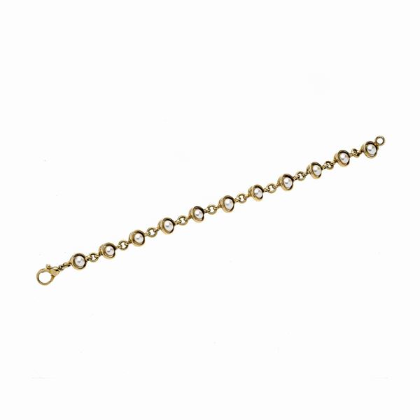 MATERIALE: oro giallo e perle coltivate DESCRIZIONE: bracciale realizzato con perle racchiuse in maglie circolari, unite tra loro con altre maglie circolari, firmato Cusi, reca il marchio 750 MISURE: aperto cm 19.3 PESO: gr 24.5