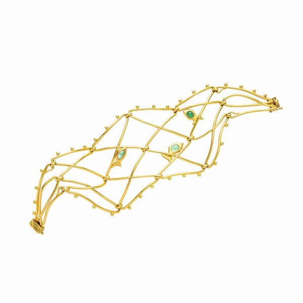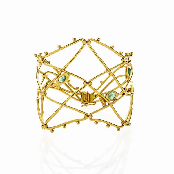 MATERIALE: oro giallosatinato e smeraldi DESCRIZIONE: bracciale di ispirazione geometrica, realizzato come una rete impreziosita con piccoli pesci centrati da smeraldo taglio cabochon, attribuito a Ashley Hicks, pezzo unico MISURE: aperto cm 17.5 PESO: gr 49.1