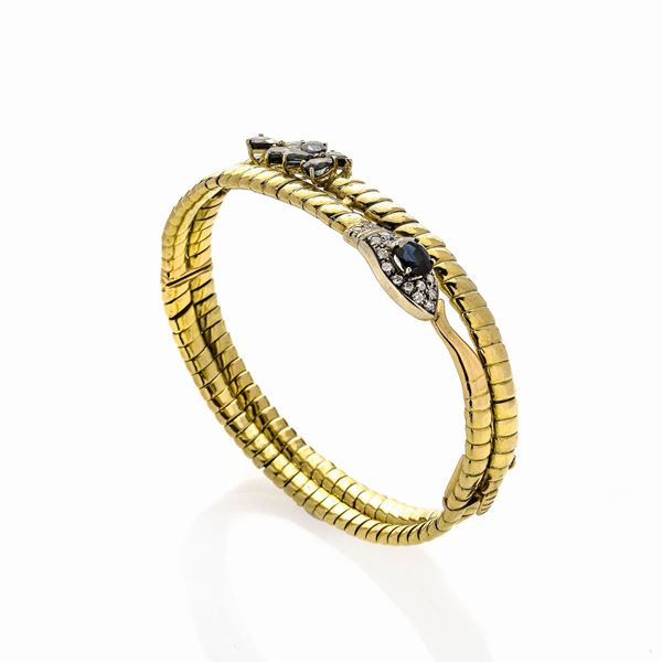 MATERIALE: oro giallo, diamanti e zaffiri DESCRIZIONE: bracciale rigido realizzato come un serpente con testa centrata da zaffiro taglio ovale su pavè di diamanti, corpo ad imitazione delle squame, coda con sette zaffiri taglio goccia, reca il marchio 750 MISURE: chiuso diametro interno cm 6 PESO: gr 48.2