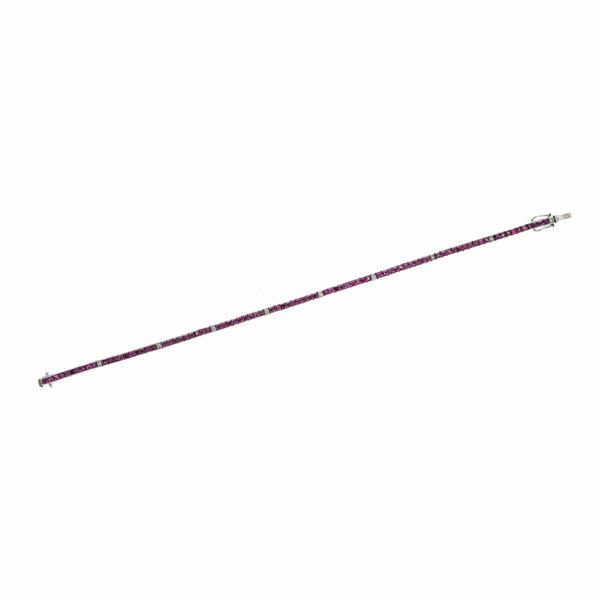 MATERIALE: oro bianco, diamanti e rubini DESCRIZIONE: bracciale tennis realizzato con rubini taglio carrè impreziositi da piccoli diamanti, reca il marchio 18 kt e 750 MISURE: aperto cm 21.5 PESO: gr 17.7