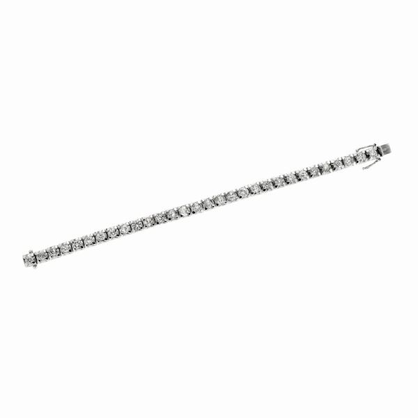 MATERIALE: oro bianco e diamanti DESCRIZIONE: bracciale tennis realizzato con ventotto diamanti taglio vecchio e i due finali di taglio brillante MISURE: bracciale aperto cm 17.5 PESO: diamanti taglio vecchio ct 10 e due diamanti taglio brillante ct 0.35 totali, gr 32.2