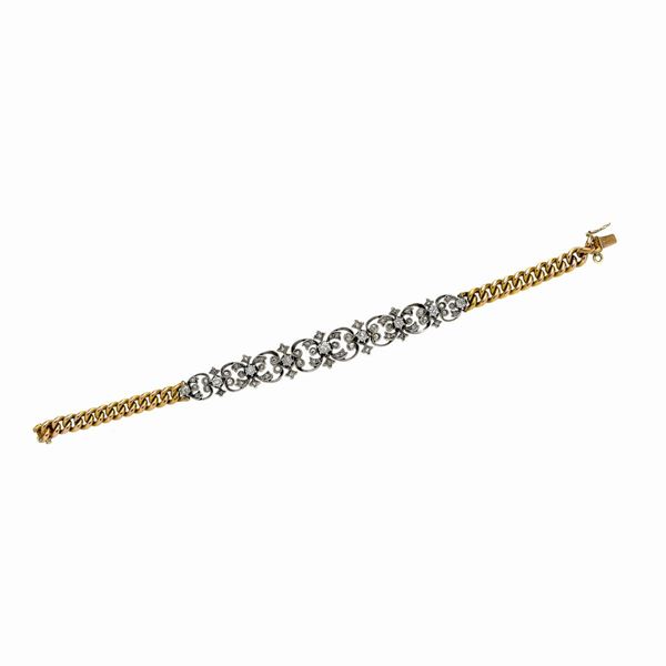 MATERIALE: oro giallo, oro a basso titolo, argento e diamanti DESCRIZIONE: braccialetto realizzato, nella parte centrale con tralcio di foglie e fiori interamente impreziositi da diamanti taglio vecchio e rose di diamante e nelle parti laterali con maglie intrecciate, reca inciso il numero 24 e reca il marchio 585 MISURE: aperto cm 17.5 PESO: gr 18.4