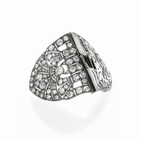 MATERIALE: platino e diamanti DESCRIZIONE: clip realizzata a tricot come uno scudo interamente impreziosita da diamanti taglio vecchio, parte posteriore in oro bianco sostituita negli anni sessanta MISURE: cm 3.5x3.54 PESO: diamanti ct 2.20, gr 19