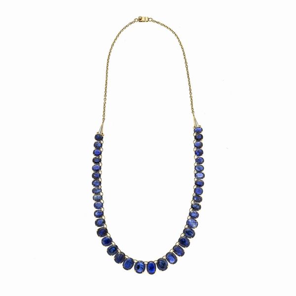 MATERIALE: oro giallo e zaffiri DESCRIZIONE: collier realizzato con catena a maglie intrecciate e nella parte anteriore con trentasette zaffiri di taglio ovale degradè MISURE: aperto cm 43 PESO: zaffiri ct 49.0, gr 27.5