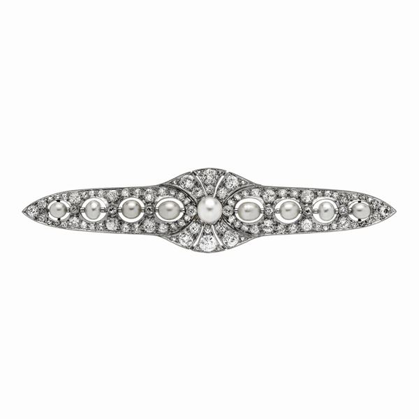 MATERIALE: in platino, diamanti e perle DESCRIZIONE: spilla a barretta di ispirazione floreale, realizzata a tricot, con al centro nove perle interamente impreziosite da diamanti taglio vecchio, corredata di scatola originale " F.B. Thomas&C, 163 new Bond street" MISURE: spilla cm 9.5x2.2h PESO: perle diametro mm da 4 a 6 , diamanti ct 4.90, colore G, purezza VS-SI, gr 16.9