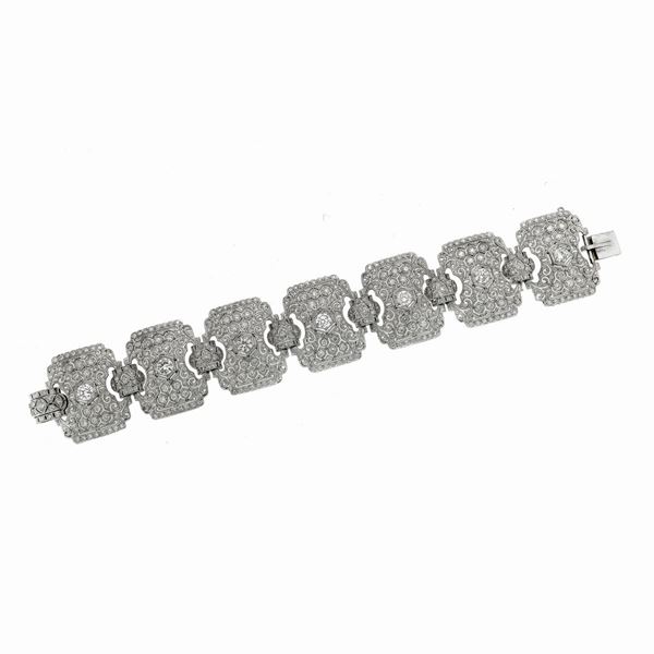 MATERIALE: platino e diamanti DESCRIZIONE: importante bracciale realizzato con sette placche leggermente bombate, ciascuna eseguita a tricot, con motivo a nido d'ape, interamente impreziosita da diamanti taglio vecchio e centrata da diamante taglio vecchio, le placche sono collegate da maglie tubolare che presentano il motivo a nido d'ape abbellito da diamanti taglio vecchio, reca il marchio Platinum MISURE: aperto cm 18.5 PESO: diamanti complessivi ct 7.30, colore H, purezza VS-SI, gr 53.4