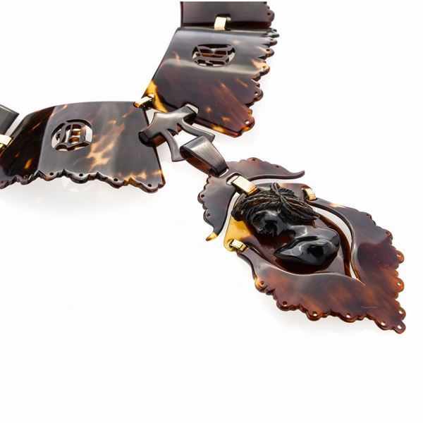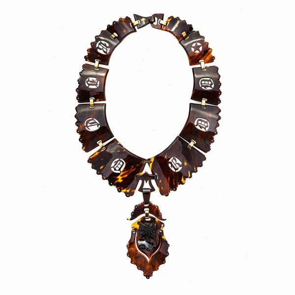MATERIALE: oro giallo e tartaruga DESCRIZIONE: importante collana "a colletto" realizzata con otto grandi placche incise, ciascuna con una lettera a formare la parole "Ricordo" e profilo sagomato, unite le une alle altre da maglie in oro giallo, al centro grande pendente a scudo centrato da profilo femminile all'antica, lieve difetto su una placca MISURE: aperta cm 44, pendente centrale cm 5x10h PESO: gr 51.4