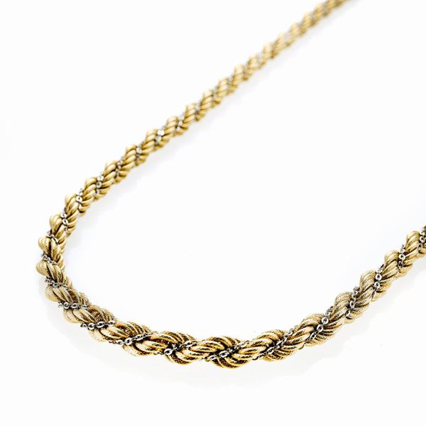 MATERIALE: oro giallo e oro bianco DESCRIZIONE: lunga collana a torchionne realizzata ad imitazione della passamaneria, reca il marchio 750 MISURE: aperta cm 111 PESO: gr 110,4