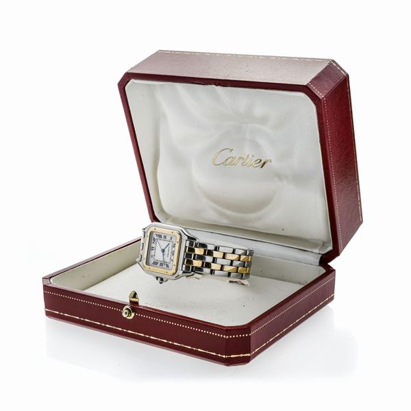 MATERIALE: acciaio e oro giallo DESCRIZIONE: cassa quadrata in acciaio, corona con zaffiro cabochon, quadrante bianco con indici in numeri romani e datario, movimento al quarzo, bracciale Panthere e chiusura in acciaio originali, corredato da scatola originale MISURE: quadrante mm 28