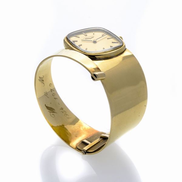 MATERIALE: oro giallo DESCRIZIONE: orologio da signora con quadrante quadrato, ghiera liscia, quadrante dorato con indici in oro giallo applicati, lancette a bastone, movimento a carica manuale, bracciale avvolgente, rigido, in oro giallo, reca incisa una dedica all'interno "W a M 1954-1979" MISURE: quadrante mm 28, bracciale diametro interno cm 5.5 PESO: gr 75.3