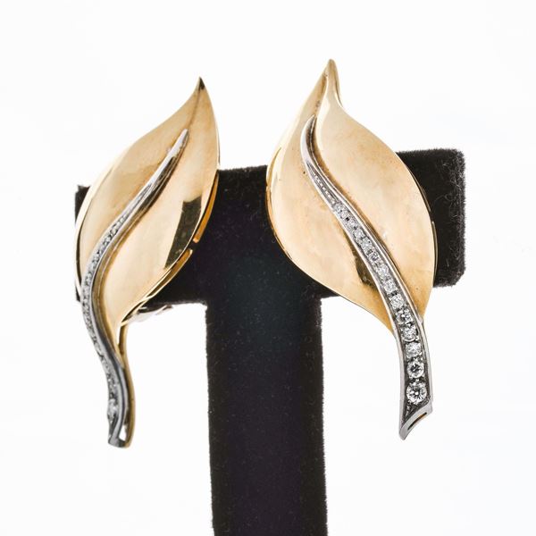 MATERIALE: oro giallo, oro bianco e diamanti DESCRZIONE: paio di grandi orecchini realizzati come una foglia leggermente bombata, ciascuno impreziosito da diamanti taglio brillante MISURE: cm 1.8 x 4.6h PESO: diamanti ct 0.35, gr 17.8