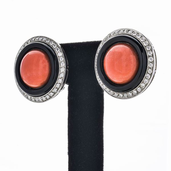 Paio di orecchini a clips in oro bianco, diamanti, onice e corallo rosso