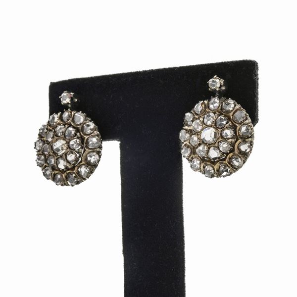 MATERIALE: oro a basso titolo e diamanti DESCRIZIONE: paio di orecchini a scudo, ciascuno interamente impreziosito da rose coronè di diamanti MISURE: 1.6x2.5h PESO: diamanti ct 3.0, gr 4.9