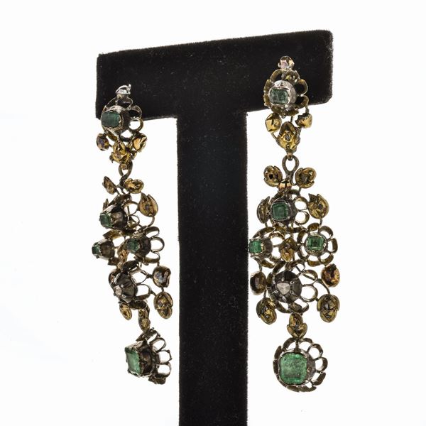 Paio di orecchini in oro a basso titolo, diamanti e smeraldi